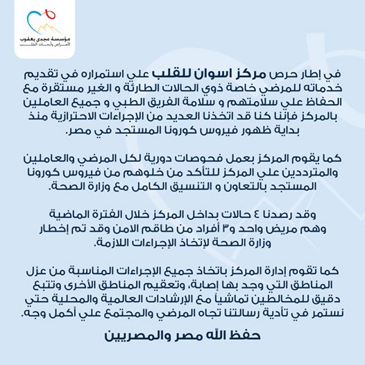 وأكد المركز ، حرصه على تقديم خدماته للمرضى وذوى الحالات الطارئة والغير مستقرة، مع الحفاظ على سلامتهم وسلامة الفريق الطبى وجميع العاملين، وأوضح المركز انه اتخذ جميع الإجراءات الاحترازية، منذ بدء ظهور فيروس كورونا فى مصر .
