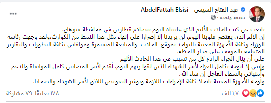 وقال الرئيس السيسى،  عبر صفحته الرسمية "فيس بوك": "تابعت عن كثب الحادث الأليم الذى عاينناه اليوم بتصادم قطارين فى محافظة سوهاج، إن الألم الذى يعتصر قلوبنا اليوم، لن يزيدنا إلا إصرارا على إنهاء مثل هذا النمط من الكوارث، ولقد وجهت رئاسة الوزراء وكافة الأجهزة المعنية بالتواجد بموقع الحادث والمتابعة المستمرة وموافاتى بكافة التطورات والتقارير المتعلقة بالموقف على مدار اللحظة، على أن ينال الجزاء الرادع كل من تسبب فى هذا الحادث الأليم.