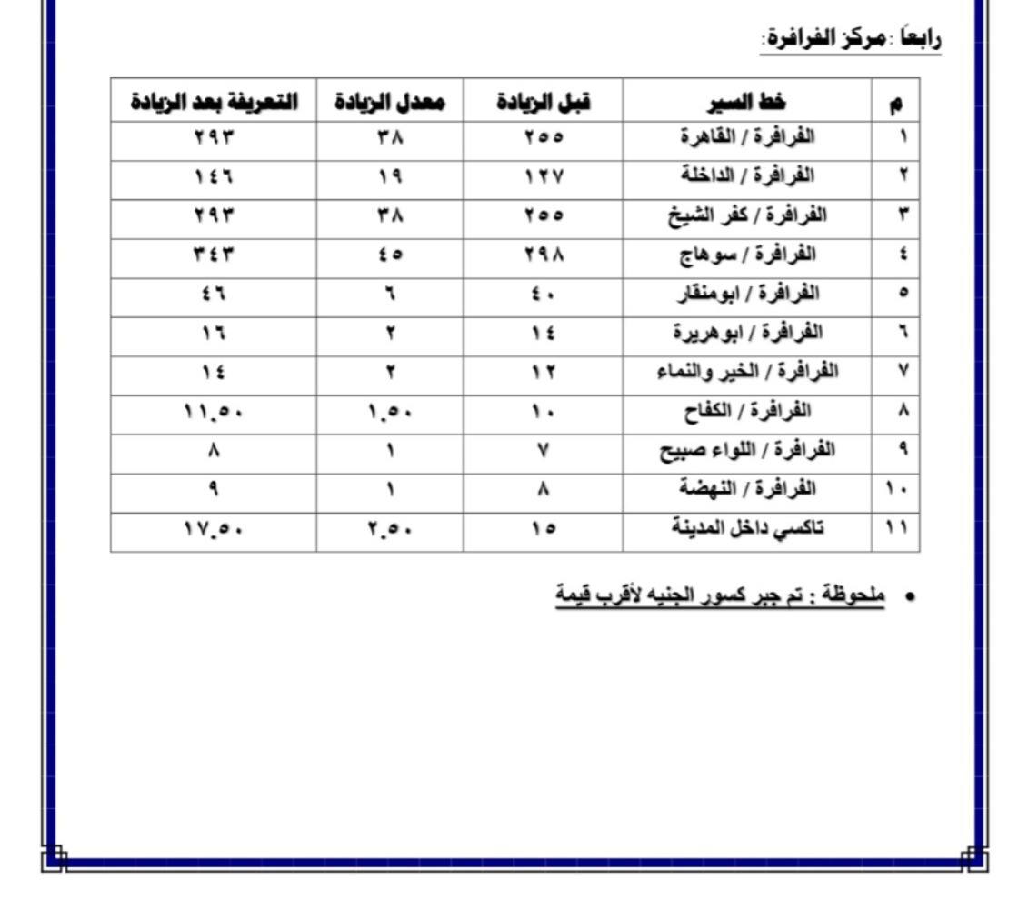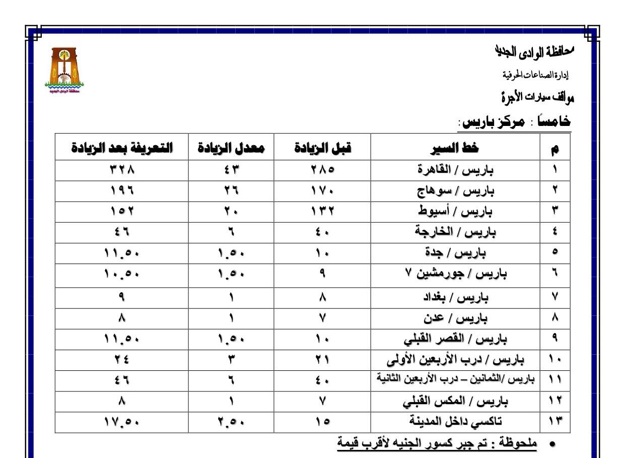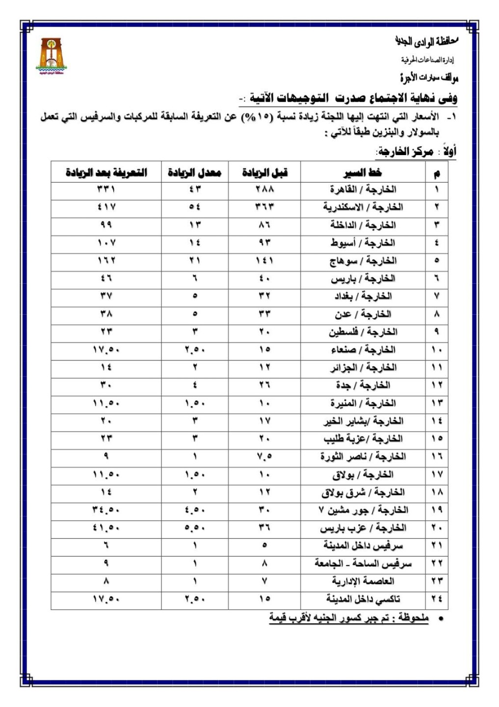 كانت اللجنة العليا للمواقف، بمحافظة الوادي الجديد، برئاسة سيد محمود، سكرتير عام المحافظة وأعضاء اللجنة ، قد عقدت اجتماعا لتحديد تعريفة الأجرة الجديدة لخطوط السير الداخلية والخارجية بالوادي الجديد.، وذلك بعد قرار تحريك أسعار الوقود