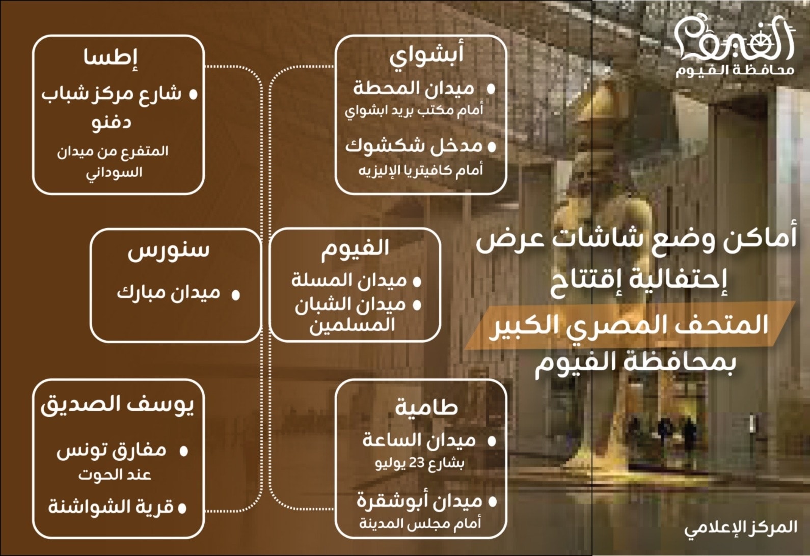 شاشات عملاقة بعدد من الميادين والمناطق الحيوية بـ الفيوم لنقل احتفالية افتتاح المتحف المصري الكبير