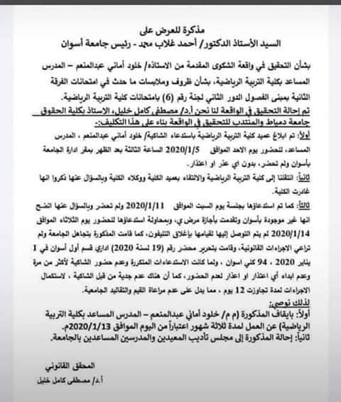 أوصت لجنة التحقيق المكلفة من قبل الدكتور أحمد غلاب، رئيس جامعة أسوان، بإيقاف "خ. أ." المدرس المساعد بكلية التربية الرياضية، عن العمل 3 أشهر، وتحويلها لمجلس تأديب، وذلك علي خلفية اتهامها لطالب بالتحرش بها