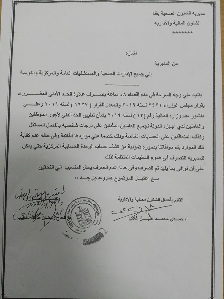 وكيل وزارة الصحة بقنا يصدر تعليماته بصرف علاوة الحد الأدني للعاملين