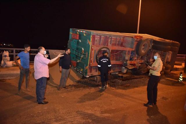 انقلاب مقطورة محملة بالفوسفات على كوبرى الواسطى بأسيوط.. والمحافظ يتابع إحتواء الأزمة