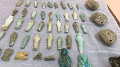 وعقب تقنين الإجراءات، تم إستهدافه بمأمورية برئاسة قطاع الأمن العام ومشاركة مديرية أمن المنيا أسفرت عن ضبطه بمنزله ، بحوزته 374 قطعة أثرية ،وعثر بحوزته على 304 عملات نحاسية ( مختلفة الأشكال والأحجام ، و ( 35 ) تمثال من الأوشابتى من الفيانس الأزرق بطول 10 سم ، و تمثالين من الأوشابتى من الفيانس الأزرق بطول 15 سم ، وتمثال من الحجر الجيرى لطفل صغير بطول 3 سم وتمثال من الخشب للإله حورس بطول 5 سم، و( 25 ) تميمة (مختلفة الأشكال والأحجام)، و( 3 ) مسرجة من الفخار متوسطة الحجم .