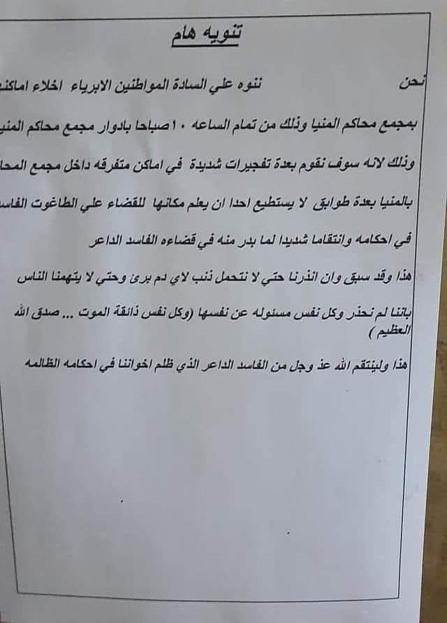 كانت وزارة العدل، قد أعلنت انها تلقت إخطارا من أمن مجمع محاكم المنيا ،حيث عثرت على منشورات تفيد وجود متفجرات بالمبنى، وعلى الفور قرر المستشار عمر مراون وزير العدل، اتخاذ الإجراءات اللازمة وإبلاغ الجهات المختصة.