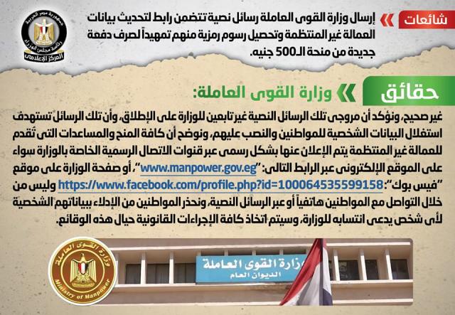 وقام المركز الإعلامي لمجلس الوزراء بالتواصل مع وزارة القوى العاملة، والتي نفت تلك الأنباء، مُؤكدةً أنه لا صحة لإرسال وزارة القوى العاملة رسائل نصية تتضمن رابط لتحديث بيانات العمالة غير المنتظمة وتحصيل رسوم رمزية منهم تمهيداً لصرف دفعة جديدة من منحة الـ 500 جنيه، مُوضحةً أن مروجي تلك الرسائل النصية غير تابعين للوزارة على الإطلاق، وأن تلك الرسائل تستهدف استغلال البيانات الشخصية للمواطنين والنصب عليهم، مُوضحةً أن كافة المنح والمساعدات التي تُقدم للعمالة غير المنتظمة يتم الإعلان عنها بشكل رسمي عبر قنوات الاتصال الرسمية الخاصة بالوزارة سواء على الموقع الإلكتروني عبر الرابط التالي www.manpower.gov.eg""، أو صفحة الوزارة على موقع "فيس بوك" "https://www.facebook.com/profile.php?id=100064535599158"وليس من خلال التواصل مع المواطنين هاتفياً أو عبر الرسائل النصية، مُحذرةً المواطنين من الإدلاء ببياناتهم الشخصية لأي شخص يدعي انتسابه للوزارة، وسيتم اتخاذ كافة الإجراءات القانونية حيال هذه الوقائع.