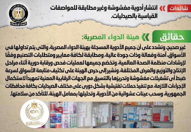 وقام المركز الإعلامي لمجلس الوزراء بالتواصل مع هيئة الدواء المصرية، والتي نفت تلك الأنباء، مُؤكدةً أنه لا صحة لانتشار أدوية مغشوشة وغير مطابقة للمواصفات القياسية بالصيدليات، مُشددةً على أن جميع الأدوية المسجلة بهيئة الدواء المصرية، والتي يتم تداولها في الأسواق، آمنة وفعالة وذات جودة عالية، ومطابقة لكافة معايير ومتطلبات التصنيع وفقًا لإرشادات منظمة الصحة العالمية، وتخضع جميعها لعمليات فحص ورقابة دورية أثناء مراحل الإنتاج والتوزيع والعرض المختلفة، مٌشيرةً إلى حرص الهيئة على تكثيف متابعة الأسواق لسرعة ضبط أي تشغيلات مغشوشة وتحريزها بالتنسيق مع الجهات الرقابية المعنية تمهيدًا لاستكمال الإجراءات اللازمة، مع تنفيذ حملات تفتيشية بشكل دوري على مختلف الصيدليات بكافة محافظات الجمهورية، وسحب عينات عشوائية من الأدوية، وتحليلها بمعامل الهيئة، للتأكد من سلامتها.