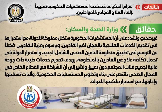 وقام المركز الإعلامي لمجلس الوزراء ، بالتواصل مع وزارة الصحة والسكان، والتي نفت تلك الأنباء، مُؤكدةً أنه لا صحة لخصخصة المستشفيات الحكومية تمهيداً لإلغاء العلاج المجاني للمواطنين، مُشددةً على أن المستشفيات الحكومية ستظل مملوكة للدولة، مع استمرارها في تقديم الخدمات العلاجية بالمجان لغير القادرين، وبرسوم رمزية للقادرين، فضلاً عن التوسع في تطبيق منظومة التأمين الصحي الشامل الجديد، واستمرار الدولة في تحمل تكلفة علاج غير القادرين بالمنظومة، بهدف تقديم خدمات طبية ذات جودة عالية لجميع فئات المجتمع دون تمييز، مُشيرةً إلى أن الشراكة مع القطاع الخاص في المجال الصحي تقتصر على بناء وتطوير المستشفيات الحكومية، وآليات تشغيلها وإدارتها، مع استمرار ملكيتها للدولة.