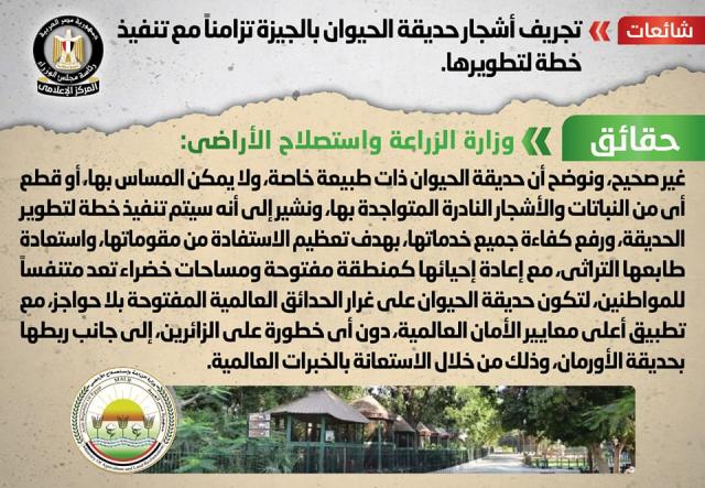 وقام المركز الإعلامي لمجلس الوزراء بالتواصل مع وزارة الزراعة واستصلاح الأراضي، والتي نفت تلك الأنباء، مُؤكدةً أنه لا صحة لتجريف أشجار حديقة الحيوان بالجيزة تزامناً مع تنفيذ خطة لتطويرها، مُوضحةً أن حديقة الحيوان ذات طبيعة خاصة، ولا يمكن المساس بها، أو قطع أي من النباتات والأشجار النادرة المتواجدة بها، مشيرةً إلى أنه سيتم تنفيذ خطة لتطوير الحديقة، ورفع كفاءة جميع خدماتها، بهدف تعظيم الاستفادة من مقوماتها، واستعادة طابعها التراثي، مع إعادة إحيائها كمنطقة مفتوحة ومساحات خضراء تعد متنفساً للمواطنين، لتكون حديقة الحيوان على غرار الحدائق العالمية المفتوحة بلا حواجز، مع تطبيق أعلى معايير الأمان العالمية، دون أي خطورة على الزائرين، إلى جانب ربطها بحديقة الأورمان، وذلك من خلال الاستعانة بالخبرات العالمية.