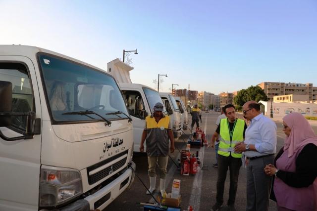ضمن أسيطول يضم 40 سيارة.. محافظ أسوان يتفقد سيارات منظومة النظافة الجديدة