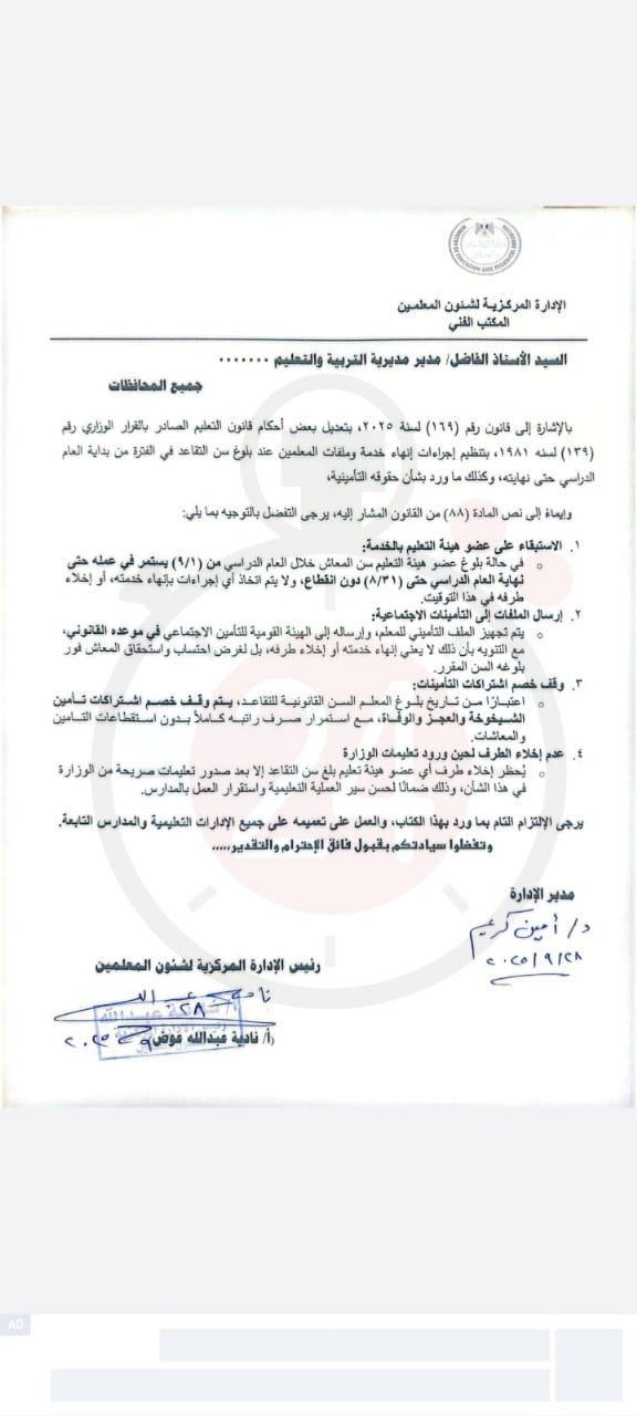كما شددت التعليمات، على ضرورة التزام جميع الجهات المختصة والإدارات التعليمية والمدارس بتنفيذ ما ورد بالكتاب الدوري المرفق، ومراعاة حقوق المعلمين التأمينية والمعاشية كاملة بعد انتهاء خدمتهم فعليًا في نهاية العام الدراسي.