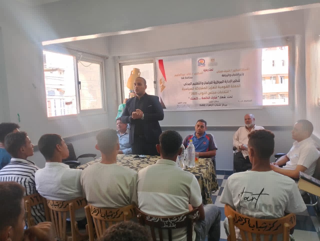 جاء اللقاء، برعاية الدكتور أشرف صبحي، وزير الشباب والرياضة، والدكتور خالد عبد الحليم، محافظ قنا، وتوجيهات بهاء شوقي ،وكيل وزارة الشباب والرياضة بالمحافظة، واستهدف رفع الوعي السياسي لدى الشباب وتعزيز ثقافة المشاركة الإيجابية في العملية الانتخابية باعتبارها دعامة أساسية للديمقراطية وبناء الوطن.
