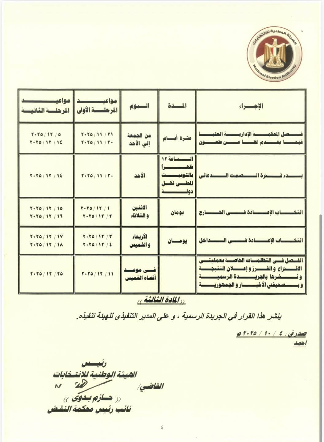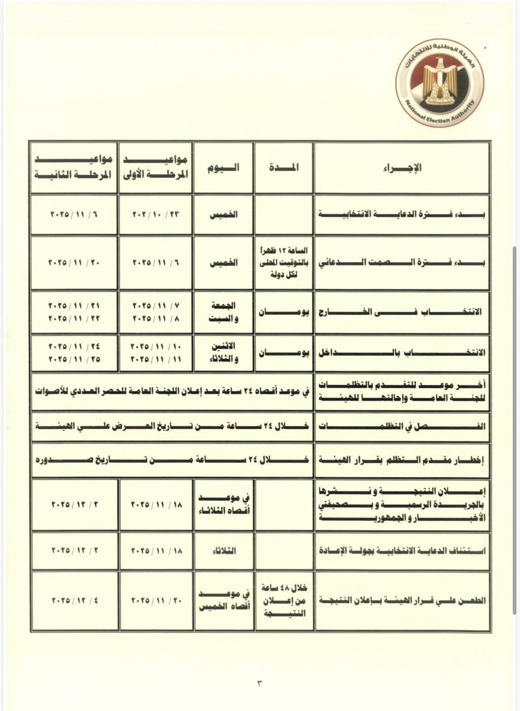 وبالنسبة للمرحلة الثانية تبدأ فترة الدعاية الانتخابية 6 نوفمبر ويكون الصمت يوم 20 نوفمبر.