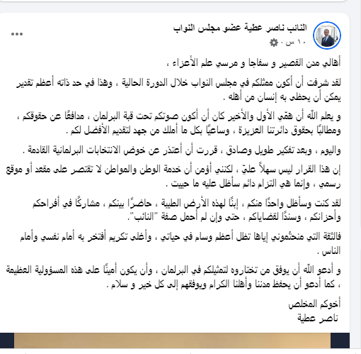 وقال عبد الناصر عطية في بيانه، أن همّه الأول والأخير كان أن يكون صوت أهالي دائرته تحت قبة البرلمان ، مدافعًا عن حقوقهم ، وساعيًا بكل ما يملك من جهد لتقديم الأفضل لهم .
