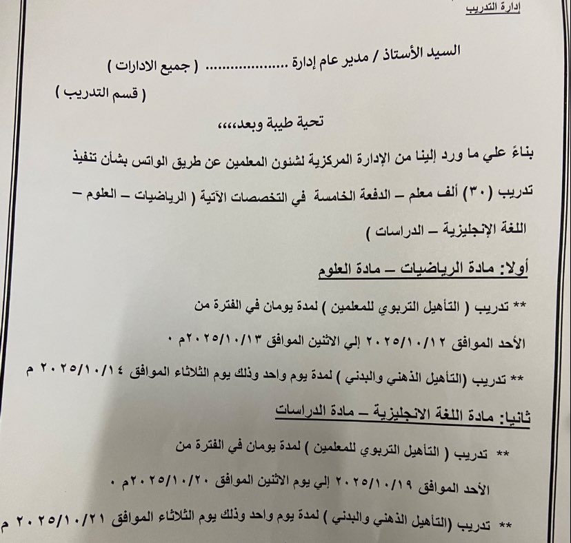 كما تعقد تدريبات التأهيل التربوي لتخصصات اللغة الانجليزية والدراسات الاجتماعية بدأ من الاحد 2025/10/19 الى الاثنين 2025/10/20 م