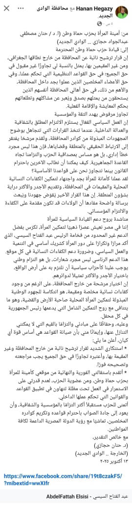 واشارت الدكتورة حنان مصطفى، إلى أن قرار ترشيح نائبة من خارج المحافظة ، ومن غير المقيمين بها، يمثل بالنسبة لي تجاوزًا غير مقبول في حق الجميع؛ وفي في حق القواعد التنظيمية التي تحكم عملنا، وفي حق الأعضاء المخلصين الذين عملوا بجد داخل المحافظة ، والأهم من ذلك، في حق أهالي المحافظة أنفسهم الذين يستحقون من يمثلهم بصدق ويُعبر عن مشاكلهم وتطلعاتهم بحكم المعايشة والإقامة الفعلية.