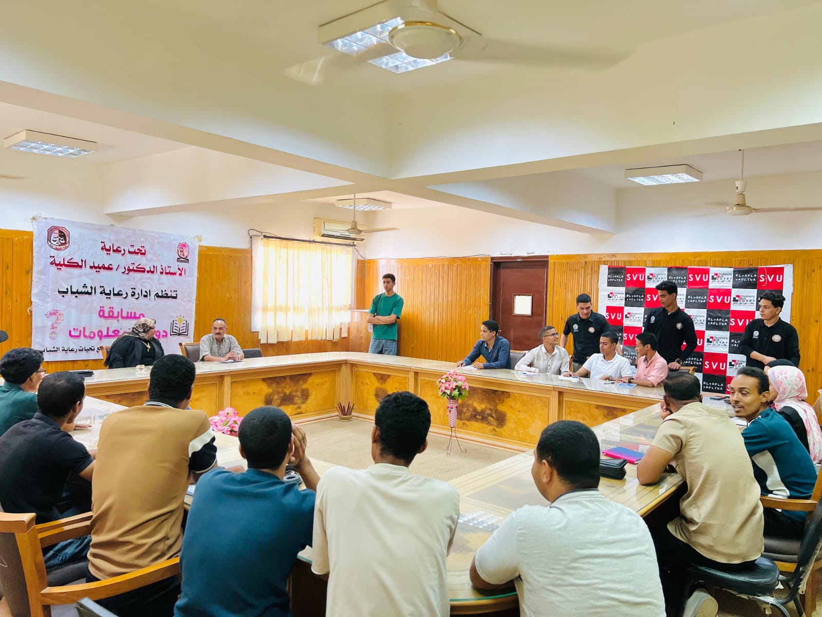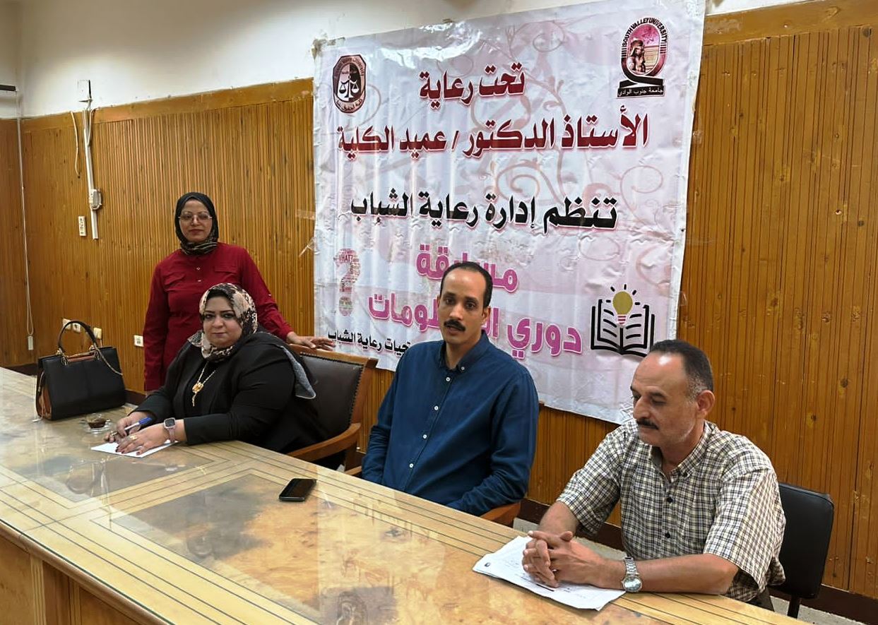 نظمت رعاية الشباب بكلية الحقوق ،جامعة قنا، مسابقة دوري المعلومات لطلاب الكلية ، وذلك لاختيار الطلاب الممثلين للكلية في المسابقات على مستوى الجامعة وتقدم مجموعة من طلاب وطالبات الكلية بجميع فرقها للمسابقة.