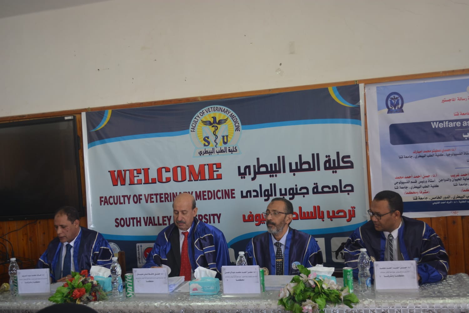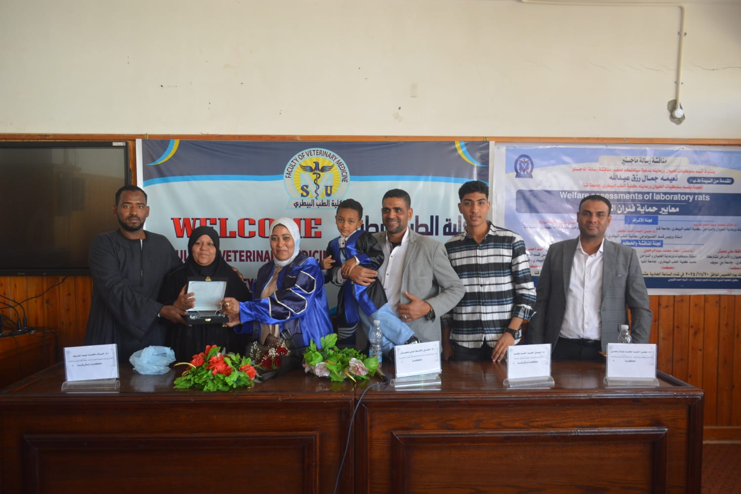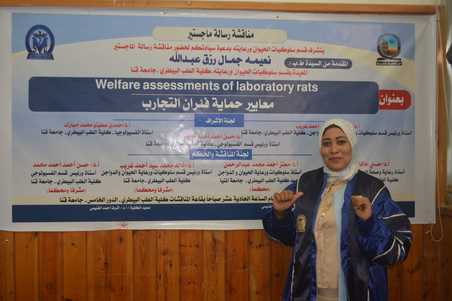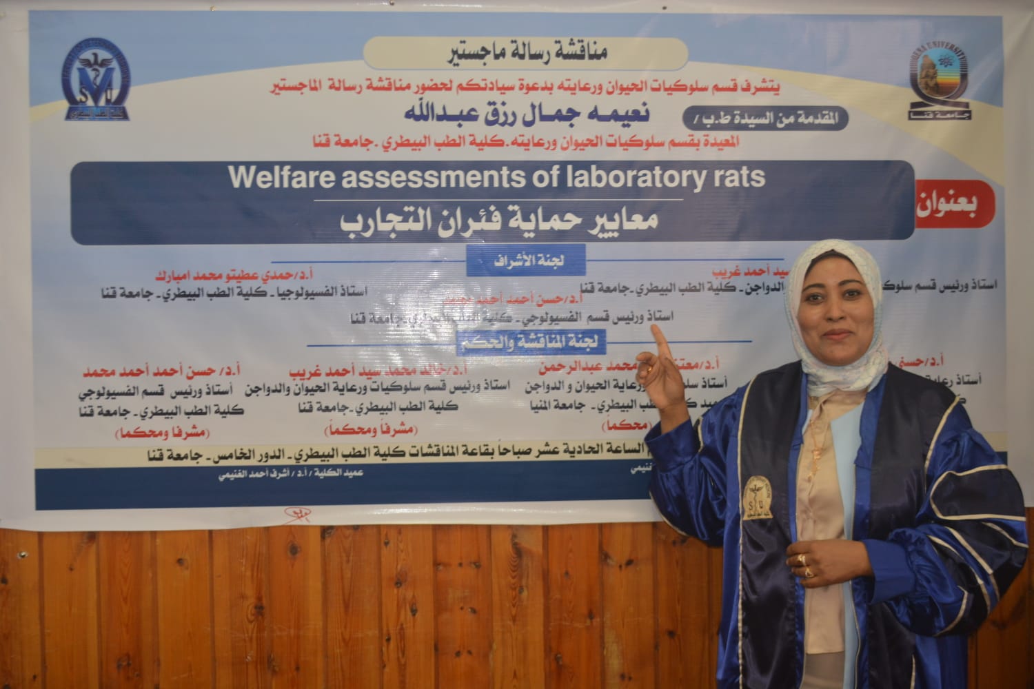 شهدت كلية الطب البيطري بجامعة قنا مناقشة رسالة الماجستير المقدمة من الباحثة نعيمة جمال رزق عبد الله، المعيدة بقسم سلوكيات الحيوان ورعايته، والتي جاءت بعنوان "معايير حماية فئران التجارب"