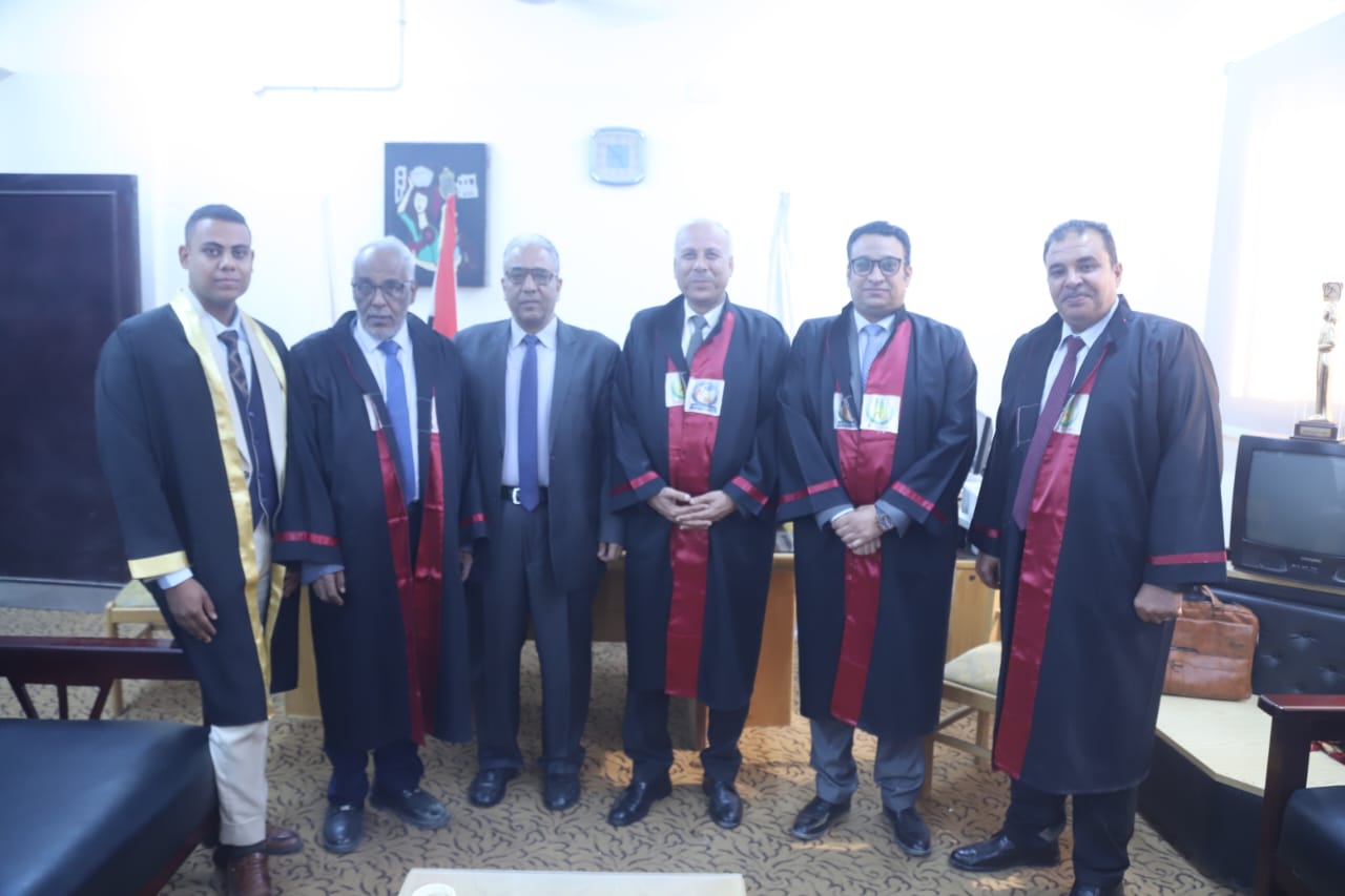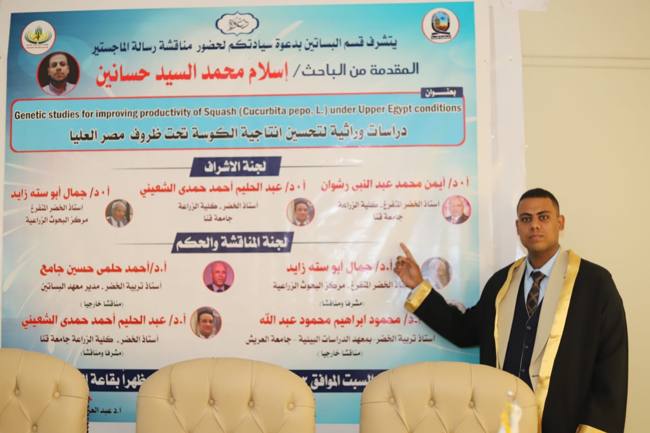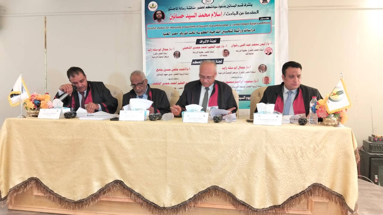 أما لجنة المناقشة والحكم فتكوّنت من: الأستاذ الدكتور جمال أبو سِتّه أستاذ الخضر المتفرغ بمركز البحوث الزراعية (مشرفًا ومناقشًا)، والأستاذ الدكتور أحمد حلمي حسين جامع أستاذ تربية الخضر ومدير معهد البساتين (مناقشًا داخليًا)، والأستاذ الدكتور محمود إبراهيم محمود عبد الله أستاذ تربية الخضر بمعهد الدراسات البيئية جامعة العريش (مناقشًا خارجيًا)، والأستاذ الدكتور عبد الحليم أحمد حمدي الشعيني أستاذ الخضر بكلية الزراعة جامعة قنا (مشرفًا ومناقشًا).
