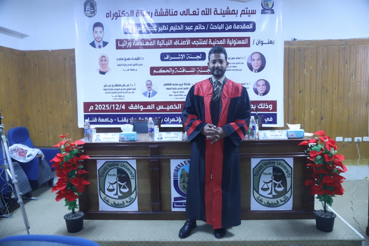 شهدت كلية الحقوق بجامعة قنا، مناقشة رسالة الدكتوراة المقدمة من الباحث حاتم عبد الحليم نظير عبد الوهاب، والتي جاءت بعنوان "المسؤولية المدنية لمنتجي الأصناف النباتية المهندسة وراثياً"