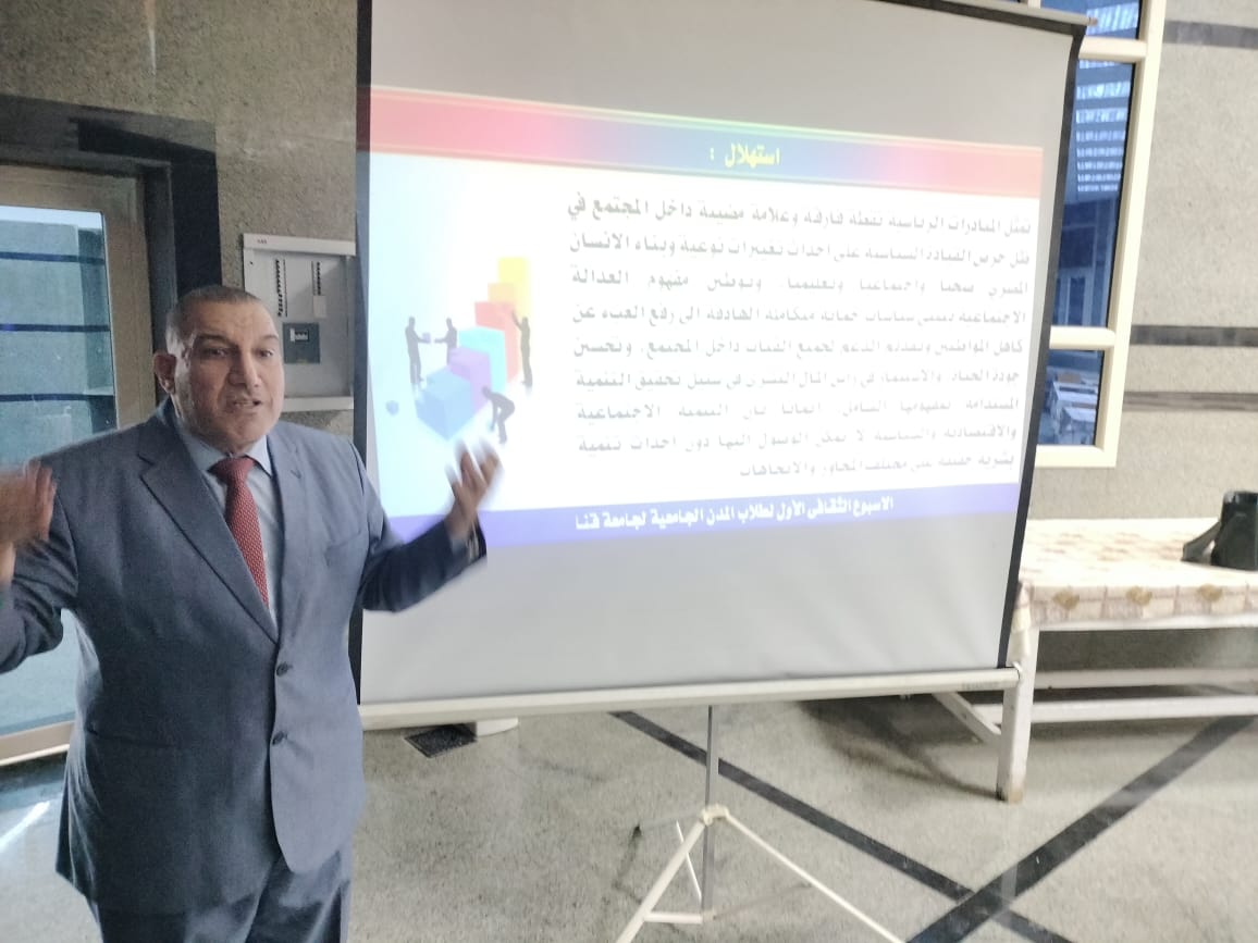 نظمت :جامعة قنا " أسبوعًا ثقافيًا متنوعًا لطلاب المدن الجامعية (بنين وبنات)، وتأتي ندوة اليوم التثقيفية تحت عنوان: «المبادرات الرئاسية لتنمية الإنسان المصري»، ألقاها الدكتور علي الدين عبد البديع القصبى، أستاذ علم الاجتماع المساعد بالجامعة ومنسق الأسبوع الثقافي.
