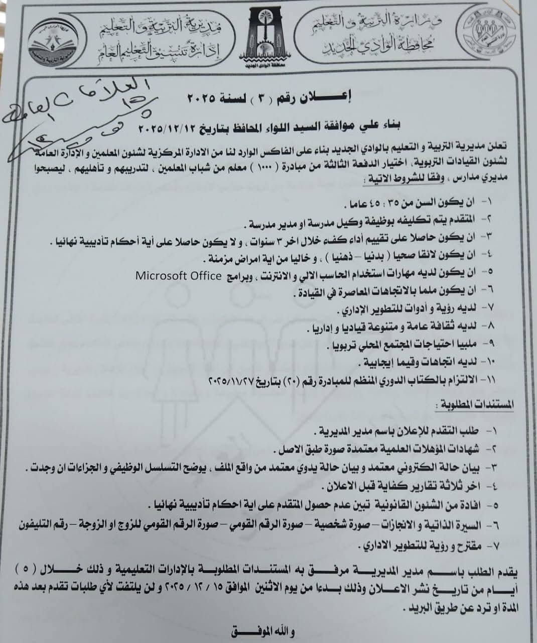 يأتي ذلك، بناء على الفاكس الوارد من الادارة المركزية لشؤون المعلمين والإدارة العامة لشؤون القيادات التربوية اختيار الدفعة الثالثة من مبادرة 1000 معلم من شباب المعلمين ، لتدريبهم وتأهليهم ، ليصبحوا مديري مدارس، وبناء على موافقة اللواء محمد الزملوط ، محافظ الوادي الجديد ، بتاريخ ٢٠٢٥/١٢/١٢.