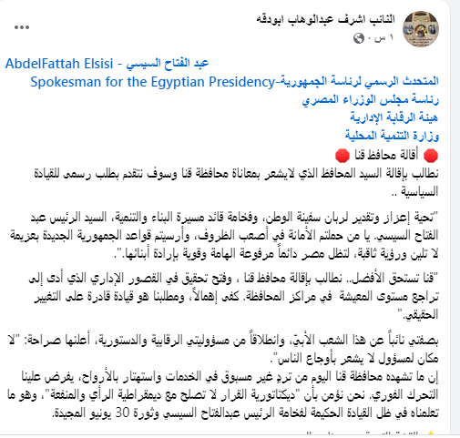 في بيان رسمي عبر صفحته الرسمية على موقع التواصل الاجتماعي فيسبوك ، طالب عضو مجلس الشيوخ بمحافظة قنا، بإقالة الدكتور خالد عبدالحليم، محافظ قنا، وفتح تحقيق عاجل في أوجه القصور الإداري ، وذلك عقب حادث انقلاب ميكروباص في ترعة والذي أسفر عن سقوط 6 ضحايا.