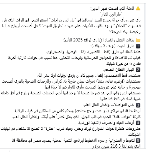 وأوضح النائب أشرف أبودقة ، أن محافظة قنا ، تعاني من نزيف مستمر على الطرق بسبب غياب الإضاءة والحواجز الخرسانية ، ولوحات التحذير على طرق حيوية أبرزها (قفط – القصير)، و(قنا – قوص)، والطريق الصحراوي، ما أدى إلى حوادث متكررة كان آخرها فقدان 6 شباب إثر انقلاب ميكروباص داخل ترعة بقرية الجبلاو، مؤكدا أن المحافظة تشهد تدهورا في الخدمات واستهتارا بأرواح المواطنين