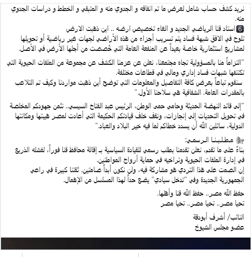 وطالب أشرف أبو دقة، بكشف حساب شامل لبرنامج التنمية المحلية بصعيد مصر في محافظة قنا، والذي تبلغ مخصصاته نحو 216.3 مليون دولار، وإعلان ما تم إنفاقه، والعائد منه، والخطط المستقبلية، إلى جانب التحقيق في ملف إلغاء تخصيص أرض استاد قنا الرياضي الجديد وشبهات تسريبها لجهات غير رياضية.