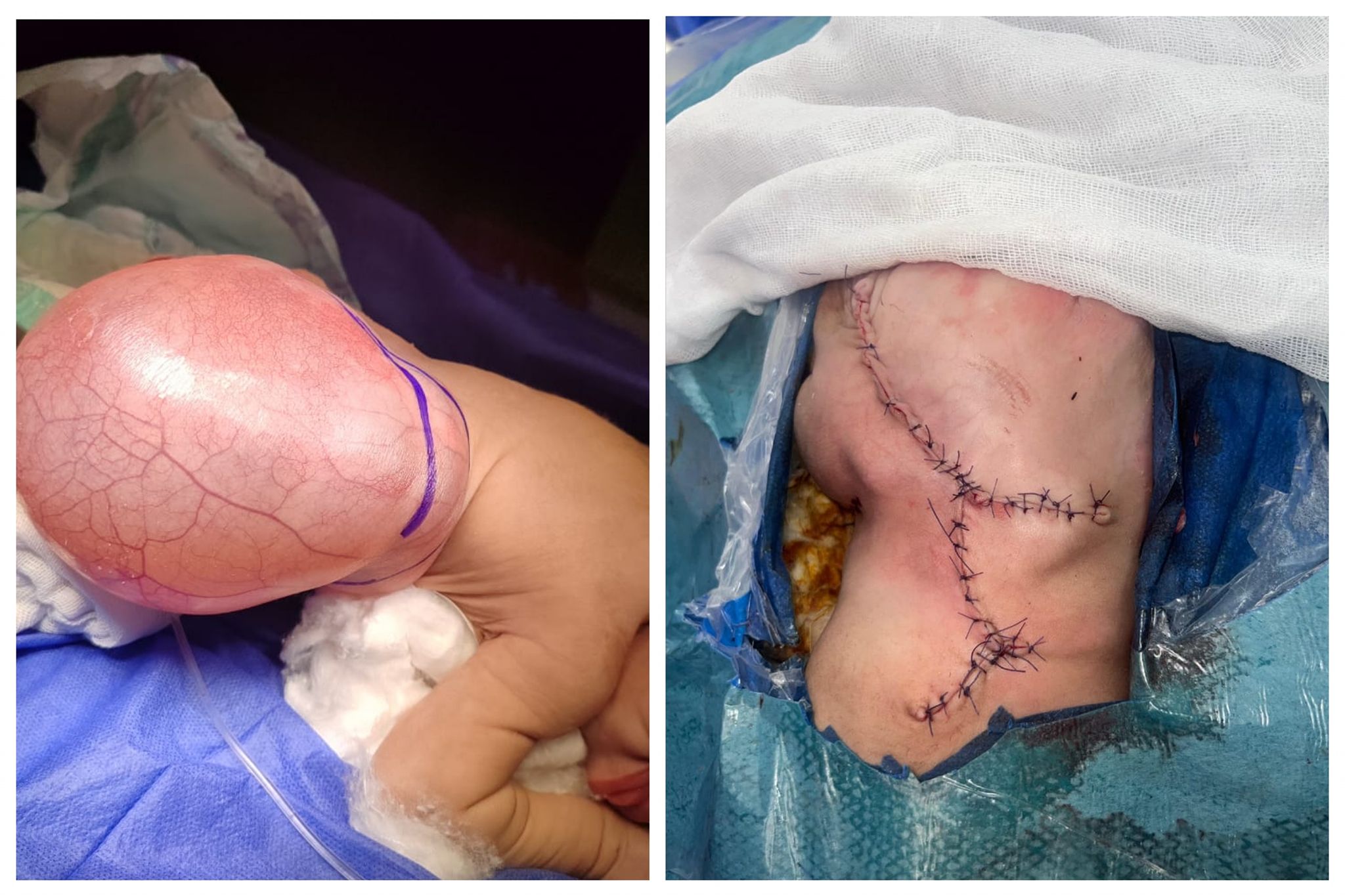 ليقوم الفريق الطبي بقسم جراحة التجميل بعد ذلك بالتعامل مع النقص الجلدي والمساحة المكشوفة بعد استئصال الكيس السحائي، حيث تم إجراء تدخلات تجميلية دقيقة لترميم الأنسجة الرخوة وتغطية العيوب الجلدية الناتجة عن العملية، لمنع تلوث الجرح وحماية الرتق العصبي.