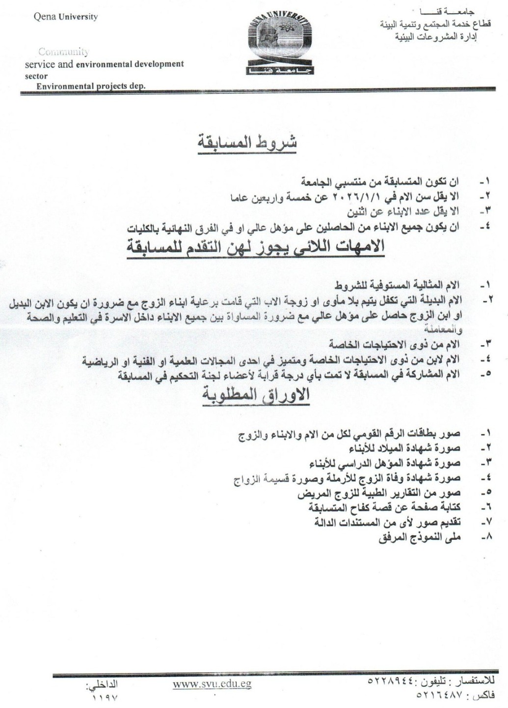 أعلنت جامعة قنا، برئاسة الدكتور أحمد عكاوي، رئيس الجامعة، عن شروط وضوابط التقدم لمسابقة الأم المثالية، والتي تستهدف تكريم النماذج المشرفة من أمهات منتسبي الجامعة،وذلط في إطار حرصها على دعم دور الأم وتقدير تضحياتها، وتعزيز قيم العطاء داخل المجتمع الجامعي.