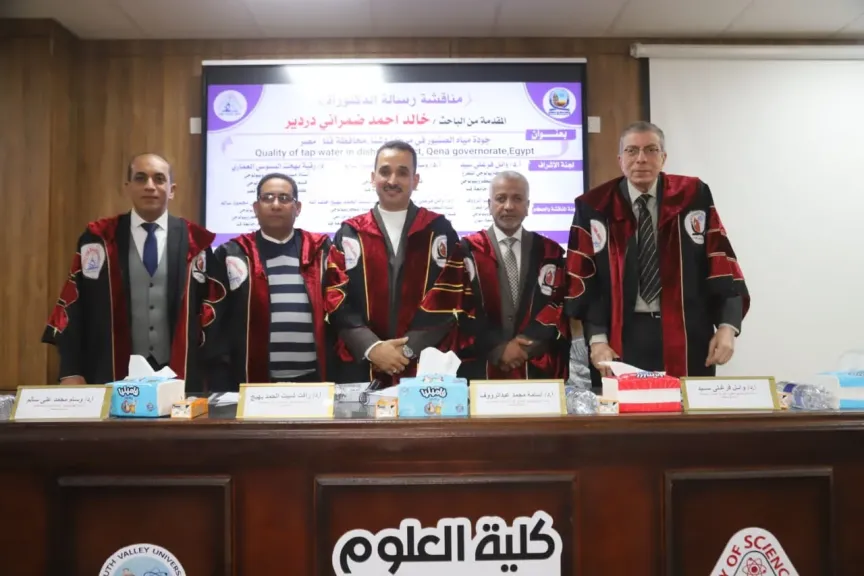 نوقشت بكلية العلوم بجامعة قنا رسالة الدكتوراه المقدمة من الباحث خالد أحمد ضمراني دردير، والتي جاءت بعنوان «جودة مياه الصنبور في مركز دشنا – محافظة قنا – مصر»، وذلك في إطار اهتمام الجامعة بدعم البحث العلمي والدراسات التطبيقية المرتبطة بقضايا البيئة والصحة العامة.