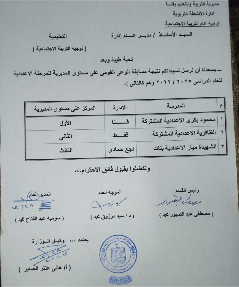 أعلنت مديرية التربية والتعليم بقن، ا نتيجة مسابقة الوعى القومى والاجتماعى لطلاب المرحلة الإعدادية والتى نظمها التوجيه العام للتربية الاجتماعية والاتحادات الطلابية ، بإشراف سوميه عبدالفتاح، مدير عام الشئون التنفيذية، وتنفيذ الدكتور سيد مرزوق، موجه عام التربية الإجتماعية على مستوى المديرية للعام الدراسى 2025-2026 م