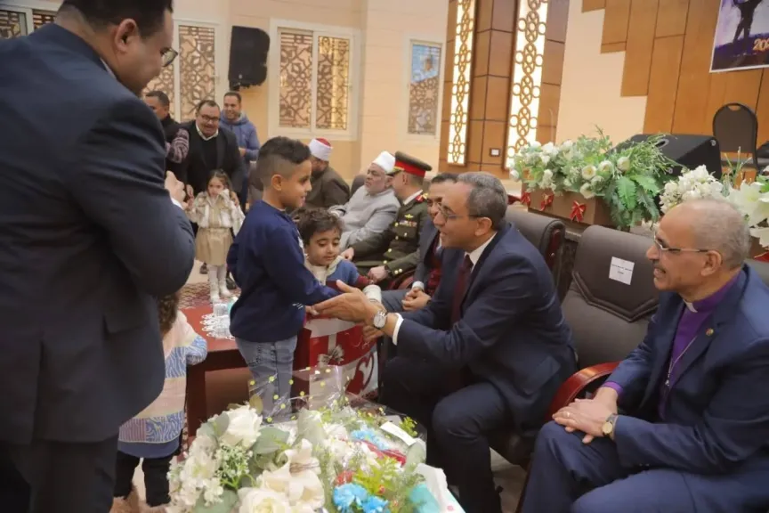 وخلال الزيارة حرص محافظ قنا على تقديم الهدايا للأطفال المحتفلين بالعيد بالكنيسة مؤكدا أن هذه اللفتات الإنسانية تعكس أسمى معاني التآخي بين المسلمين والمسيحيين وتعزز روح الانتماء والولاء الوطني لدى الأجيال الجديدة
