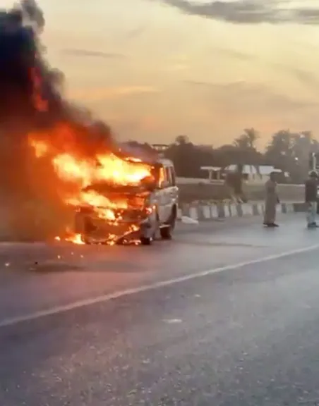 وكانت السيارة قد تعرضت لخلل فني مفاجئ في "ضفيرة الكهرباء" ، مما أدى إلى شرارة كهربائية سرعان ما تحولت إلى ألسنة لهب تصاعدت من المحرك لتمتد إلى باقي أجزاء السيارة.،و تمكن قائدها من الخروج منها سالمًا دون أن يصاب بأي أذى، حيث توقف علي جانبي الطريق فور رؤيته للأدخنة.