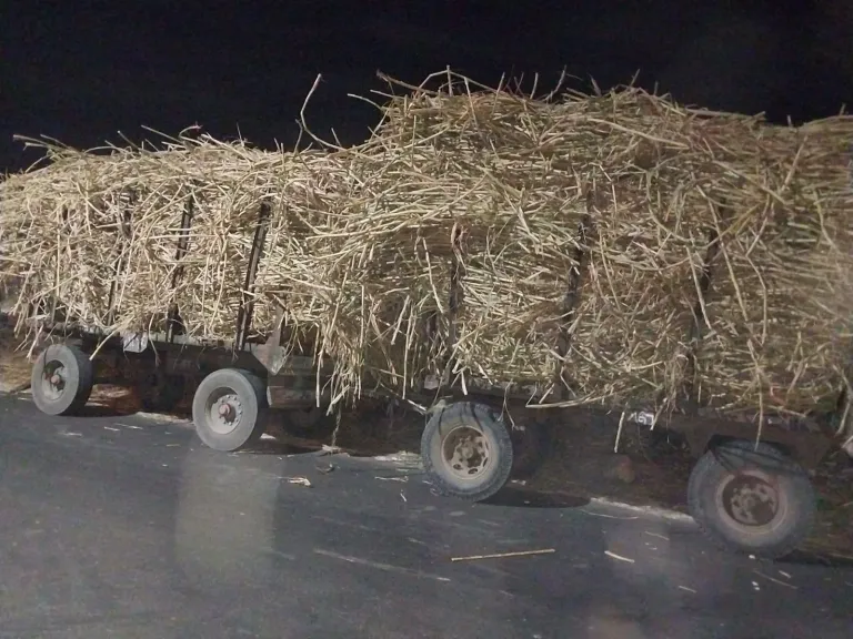 سيارات محملة بالقصب متوقفة على الطريق الزراعي