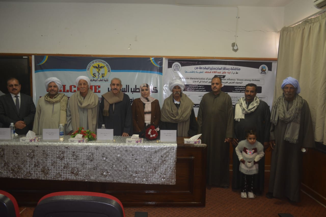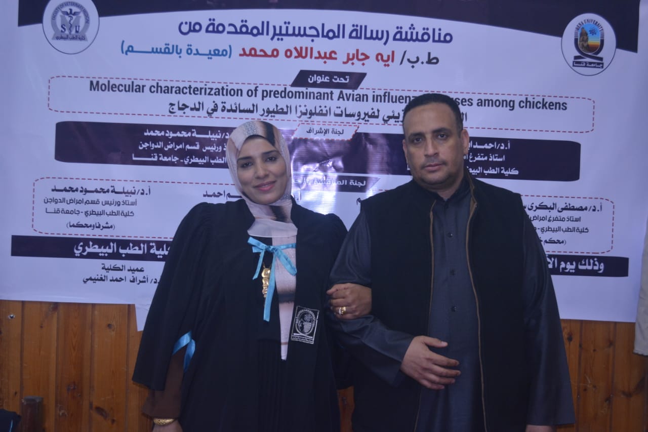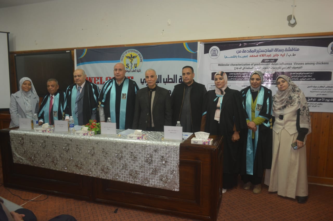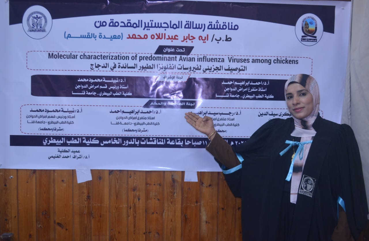 ناقشت كلية الطب البيطري بجامعة قنا رسالة الماجستير المقدمة من الباحثة آية جابر عبد اللاه محمد محمد، بعنوان: «التوصيف الجزيئي لفيروسات إنفلونزا الطيور السائدة في الدجاج»، وذلك في إطار دعم الجامعة للبحث العلمي والدراسات العليا.
