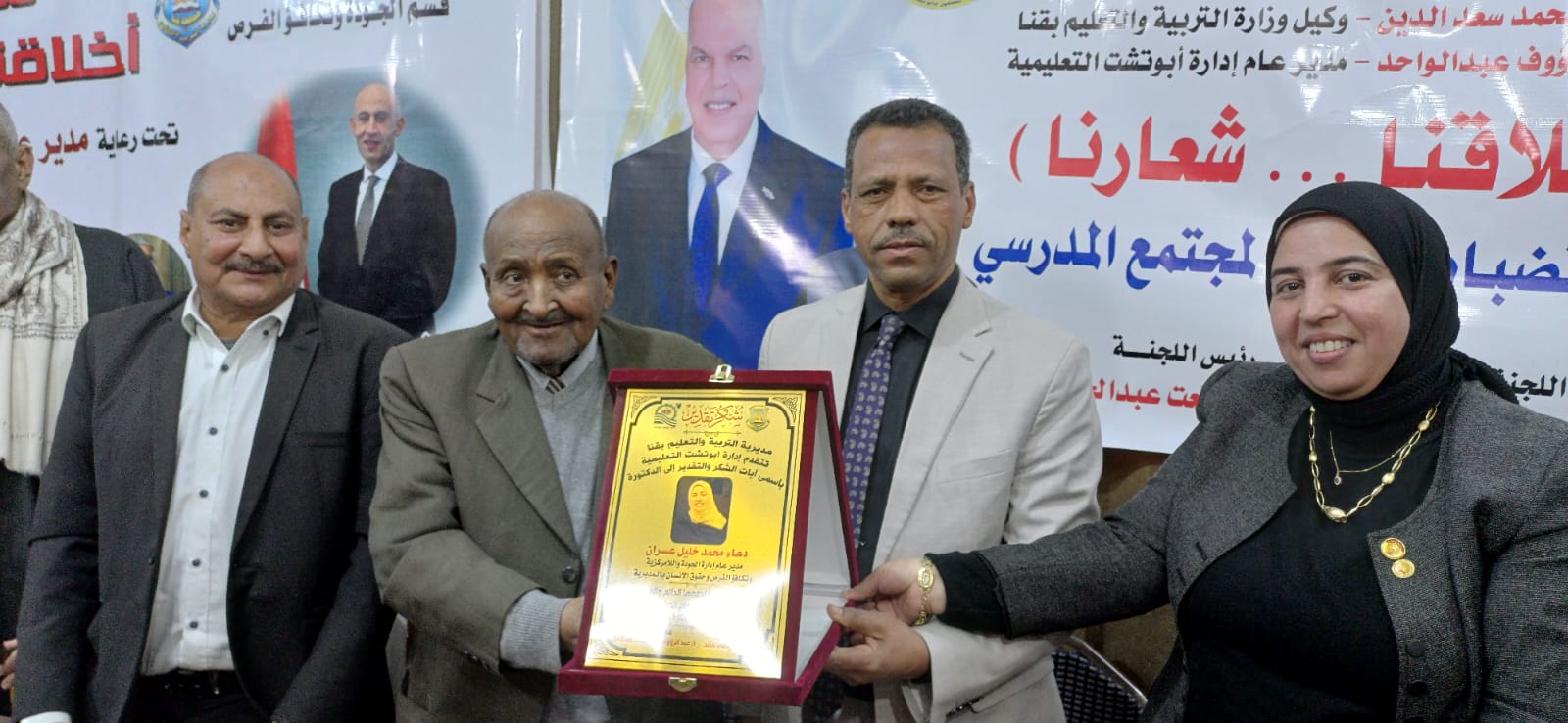 وفي ختام الحفل، تم تكريم مديري المدارس الثلاثة المختارة لاستقبال لجنة التحكيم الدولية لضمان جودة التعليم: محمود عبدالمنصف مدير مدرسة الشيخ علي، وحسين أبوالحمد مدير مدرسة قناطر نجع حمادي، ومحمد أنور مدير مدرسة نجع غلاب الابتدائية.