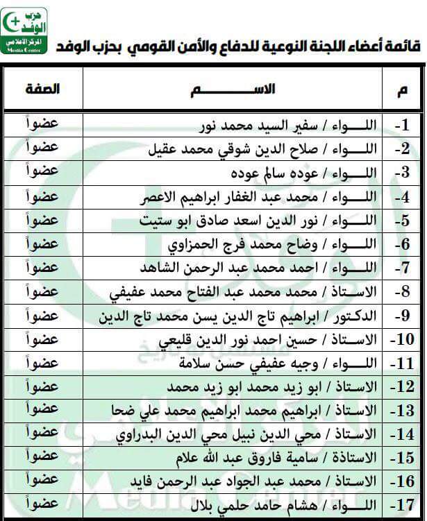 و أكد الهضيبي علي نشر باقي اللجان تباعا علي الصفحة الرسمية لحزب الوفد، وضمت قائمة اللجنة النوعية للدفاع والامن القومي ، الكثير من الاعضاء
