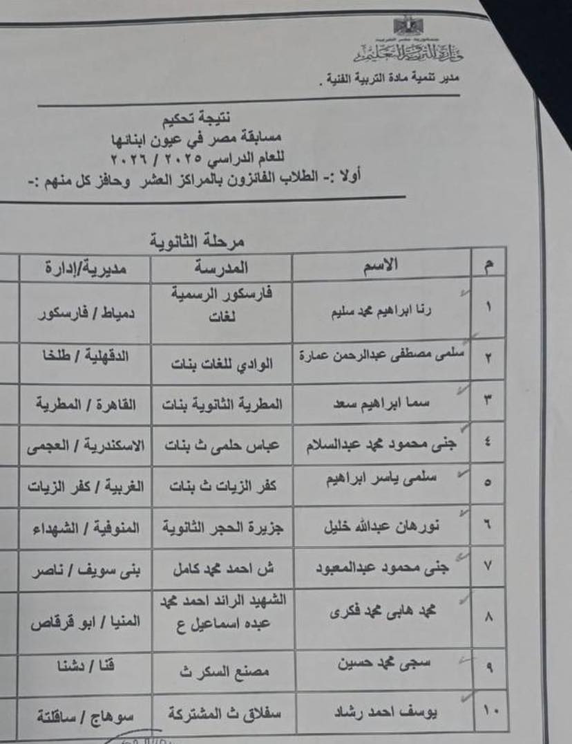 حققت مديرية التربية والتعليم بقنا ، تحت رعاية طارق سعد الدين ،وكيل وزارة التربية والتعليم ،إنجازاً جديداً على مستوى الجمهورية في مسابقة "مصر في عيون أبنائها"، التي تنظمها الإدارة المركزية للتعليم العام مكتب مستشار التربية الفنية ، في إطار توجيهات السيد محمد عبداللطيف، وزير التربية والتعليم والتعليم الفني، وتعليمات اللواء مصطفى الببلاوي ، محافظ قنا ، بضرورة تشجيع وتحفيز ودعم الطلاب المتميزين.