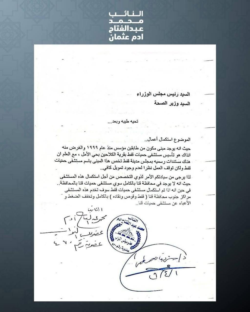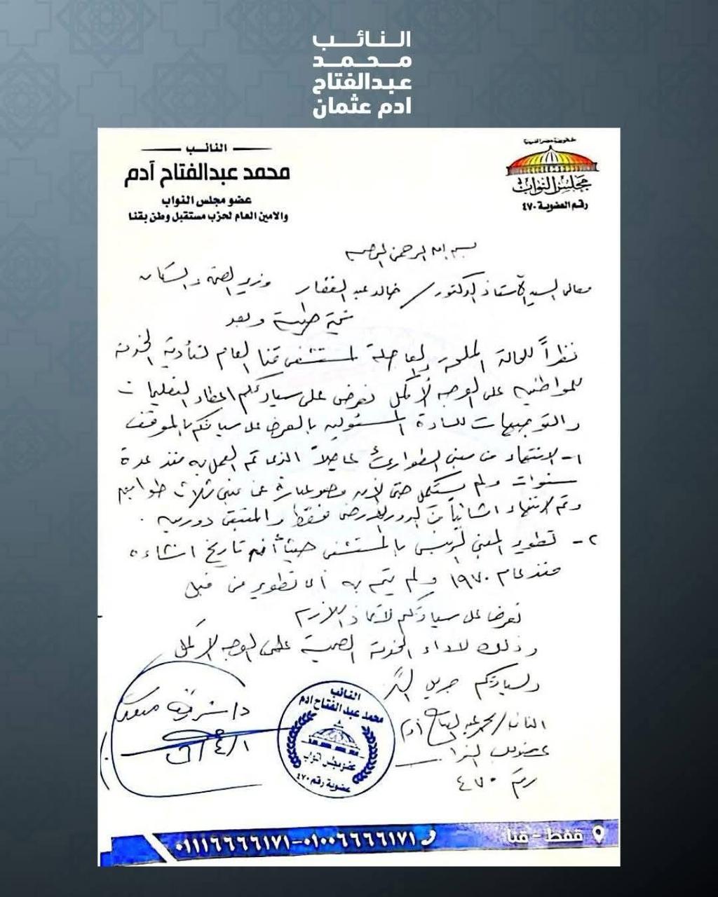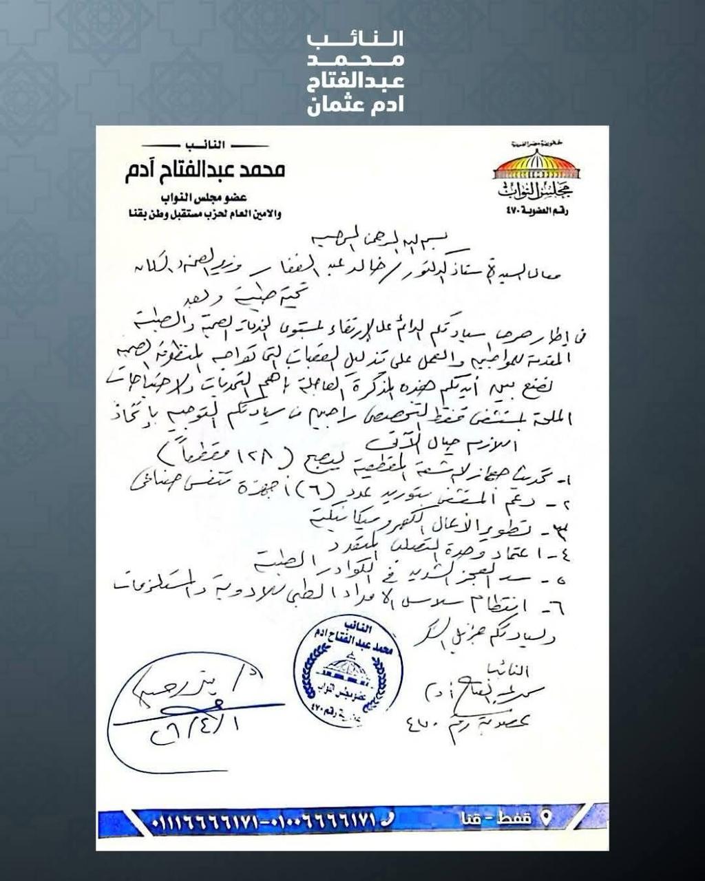 تقدم النائب محمد عبد الفتاح آدم ، عضو مجلس النواب وأمين حزب مستقبل وطن بمحافظة قنا ، بعدد من الطلبات الهامة التي تستهدف تطوير المنظومة الصحية داخل نطاق الدائرة، في ضوء ما تعانيه بعض القطاعات من احتياجات ملحة تستدعي التدخل العاجل، وذلك في إطار حرصه على خدمة أهالي دائرته، ومواصلة جهوده المستمرة لتلبية احتياجات المواطنين والعمل على تحسين مستوى الخدمات المقدمة لهم
