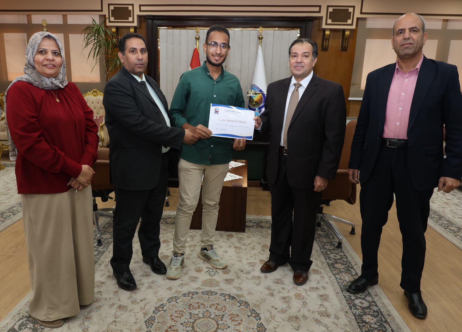 وأعرب الطالب أسامة الشاطر، عن سعادته البالغة بهذا التكريم، مؤكدا أن ما حققه من إنجاز يمثل ثمرة للدعم المستمر الذي توليه إدارة الجامعة للطلاب المتميزين، مشيدا بما يقدمه الدكتور أحمد عكاوي، رئيس الجامعة، من اهتمام حقيقي برعاية الأفكار الابتكارية وتشجيع الشباب على خوض مجالات ريادة الأعمال والابتكار