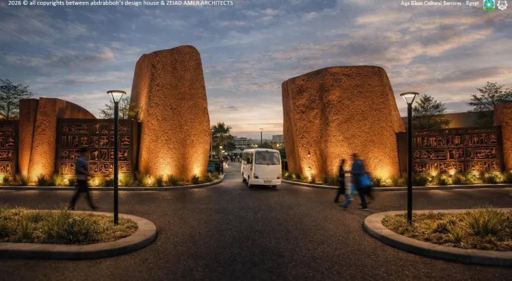 و تم إستعراض الأعمال المقترحة للتطوير والتنسيق الحضارى من خلال تنسيق المساحات الخضراء ، وإعادة تنظيم المسارات ، وإضافة إبراز الهوية المصرية القديمة فى شكل متناغم مع البيئة المحيطة .