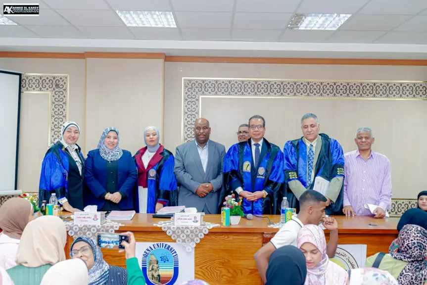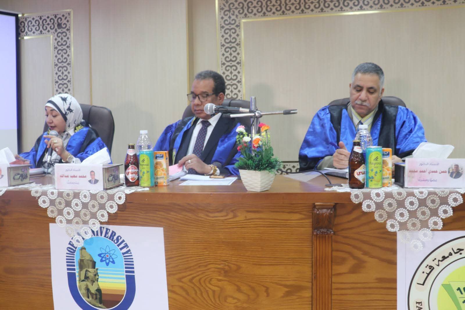 وتكونت لجنة المناقشة والحكم من الأستاذ الدكتور محمد سعيد عبدالله، نائب رئيس جامعة قنا لشؤون خدمة المجتمع وتنمية البيئة "رئيسًا ومناقشًا" ، والأستاذ الدكتور حسن حمدي أحمد، الأستاذ بكلية التربية جامعة قنا "عضوً ومشرفًا"، والأستاذة الدكتورة ريهام المليجي، عميدة كلية الطفولة المبكرة بجامعة أسيوط "عضوًا ومناقشًا".