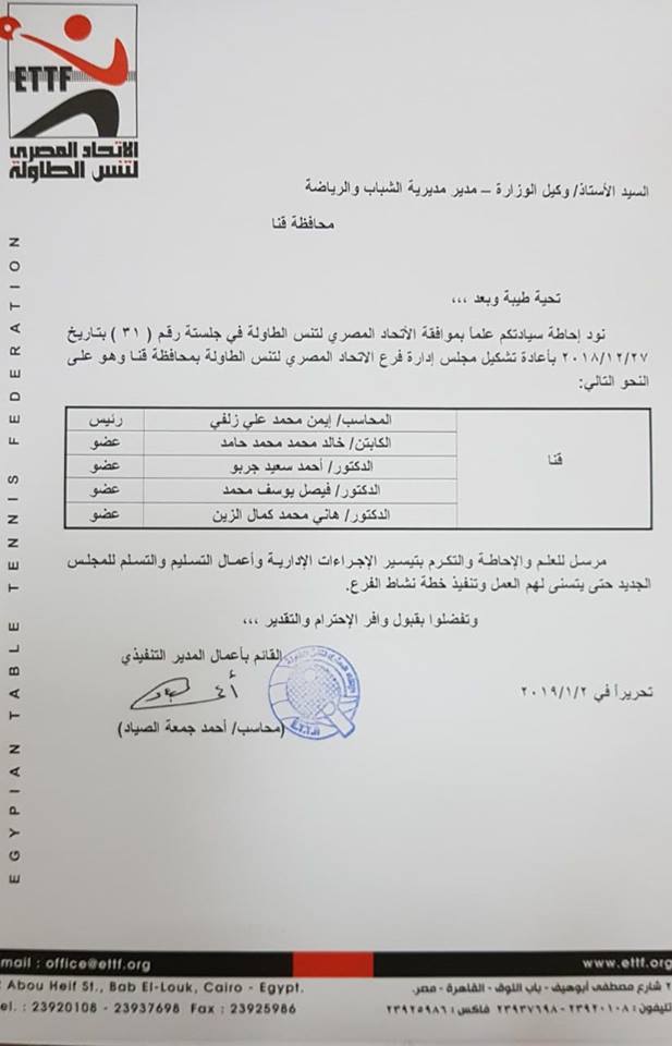 وافق الاتحاد المصرى لتنس الطاولة على إعادة تشكيل مجلس إدارة فرع الاتحاد المصرى لتنس الطاولة بمحافظة قنا.